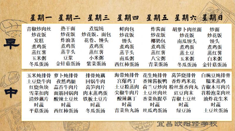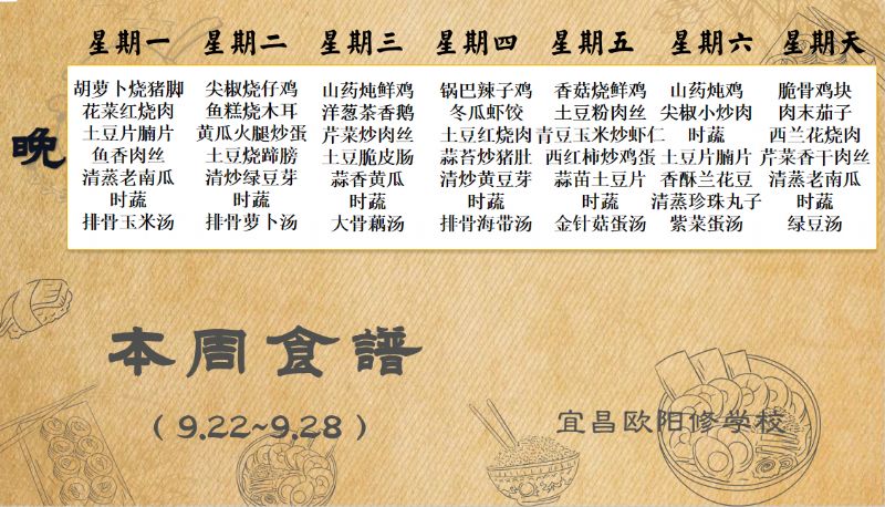 宜昌歐陽修學校每周食譜(9月22日-9月28日)