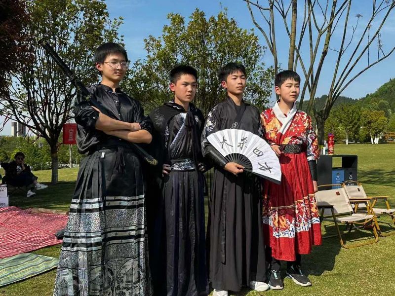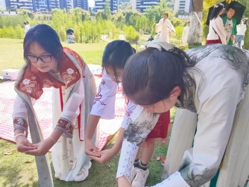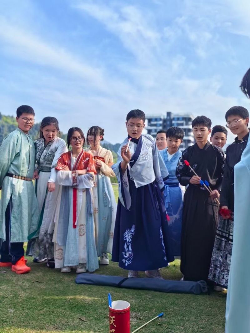 上巳正值暮春時節(jié),春天的特點(diǎn)是“生發(fā)”,所以民俗也提倡人們多活動,熱愛生命。為復(fù)原古人雅集盛況,活動還設(shè)置了傳統(tǒng)的運(yùn)動項(xiàng)目——踢毽子和投壺,同學(xué)們穿著漢服,雖襟飄帶舞,卻不影響其大展身手。
