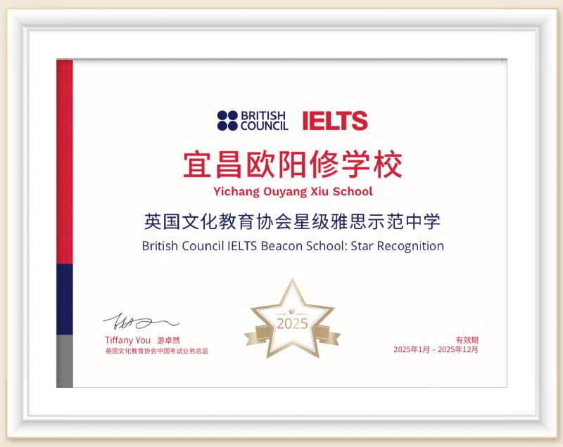 宜昌歐陽修學(xué)?,F(xiàn)設(shè)有普通高中和國際高中。20多年來,學(xué)校先后獲得“宜昌市區(qū)域現(xiàn)代化先進(jìn)學(xué)?!?、“宜昌市優(yōu)秀民辦學(xué)校”等諸多榮譽稱號,是宜昌市唯一被英國文化教育協(xié)會BritishCouncil授牌的“星級雅思示范中學(xué)”、“雅思教師培訓(xùn)基地”和“Aptis普思考點示范學(xué)?!薄ⅰ叭龒{大學(xué)外國語學(xué)院學(xué)科教學(xué)英語研究生工作站”。2023年7月,中國工程院院士,香港中文大學(xué)(深圳)校長徐楊生先生為宜昌歐陽修學(xué)校題寫校名。